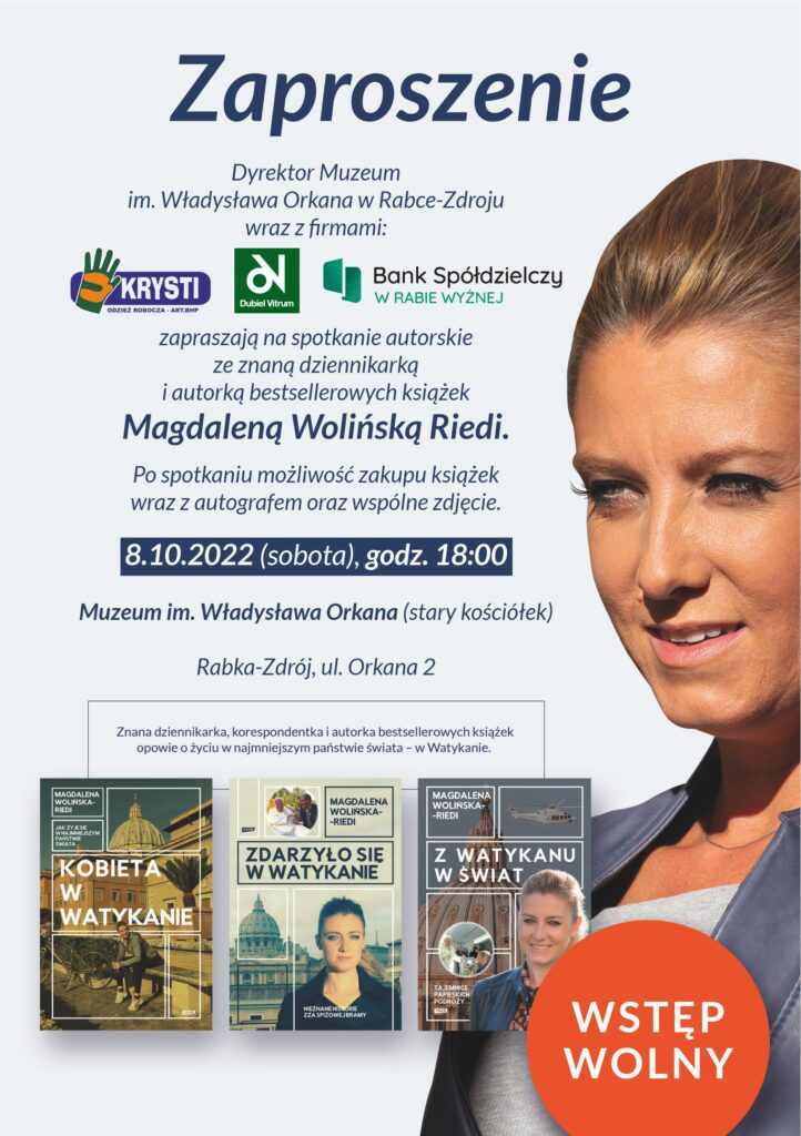 Dyrektor Muzeum im. Władysława Orkana w Rabce-Zdroju, firma 'Krysti’ i 'Dubiel Vitrum’, a także Bank Spółdzielczy w Rabie Wyżnej, mają zaszczyt zaprosić na spotkanie z Magdaleną Wolińską-Riedi,